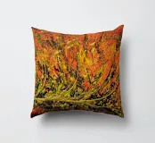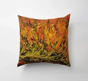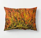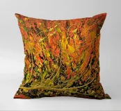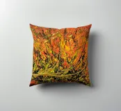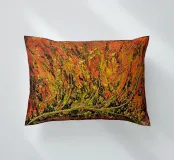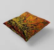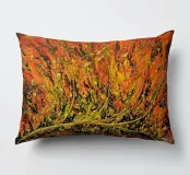 Un dipinto semi-astratto dai colori autunnali. Un ramo dorato in rilievo con piccoli frutti su uno sfondo di fogliame ocra, arancione e rosso.