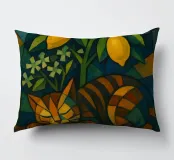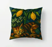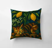Una serena composizione cubista di un gatto addormentato che riposa pacificamente sotto un albero di limoni. Forme geometriche audaci e colori ricchi e contrastanti catturano un momento di tranquillità infuso di astrazione artistica.