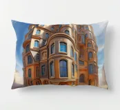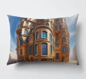 Una struttura architettonica surreale con caratteristiche curve e distorte, che fonde stili classici e moderni, si erge sotto un cielo blu brillante. La strada di ciottoli e la luce soffusa del sole esaltano l'atmosfera stravagante e onirica.