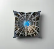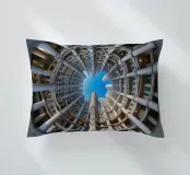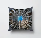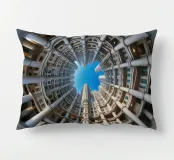 Un suggestivo disegno architettonico circolare caratterizzato da file concentriche di alte colonne ed edifici interconnessi. La prospettiva fisheye enfatizza la simmetria geometrica e si apre su un cielo azzurro e limpido, creando una scena urbana suggestiva e coinvolgente.