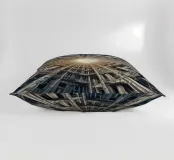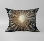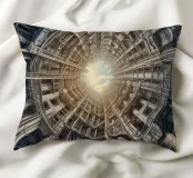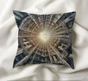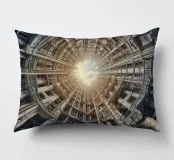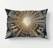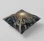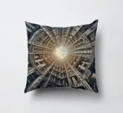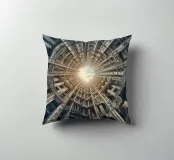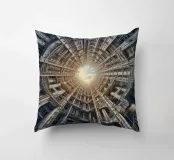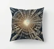 Un design architettonico intricato che forma una struttura a tunnel con simmetria a raggiera, che converge verso una luce incandescente al centro. La prospettiva crea profondità e un'estetica ipnotica e futuristica.