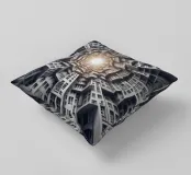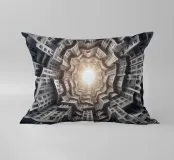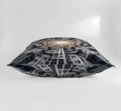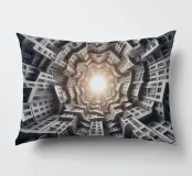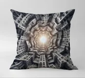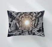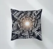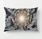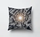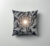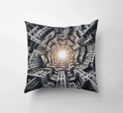 Una disposizione futuristica a spirale di edifici che convergono verso una fonte di luce radiante, creando un modello geometrico ipnotico e una profondità dinamica. I toni monocromatici esaltano l'estetica moderna e surreale.