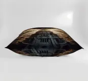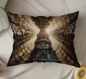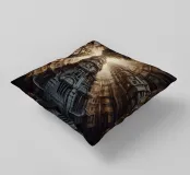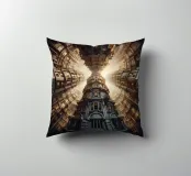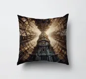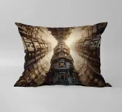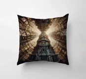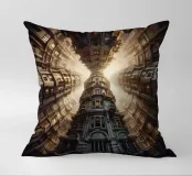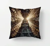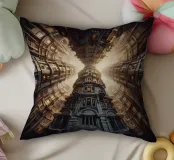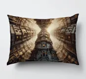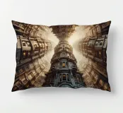 Una rappresentazione surreale di strutture architettoniche simmetriche e torreggianti che convergono verso una luce centrale incandescente. I disegni intricati, l'illuminazione calda e la prospettiva drammatica creano un'immagine impressionante e ultraterrena.