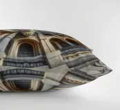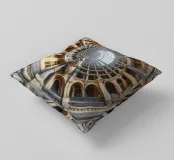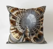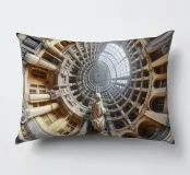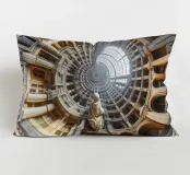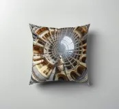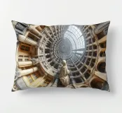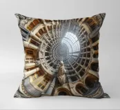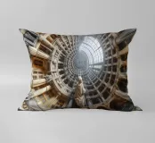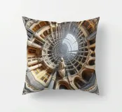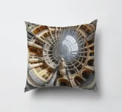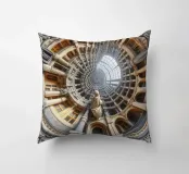 Questa immagine mostra un'intricata architettura circolare con colonne di pietra ornate, una statua centrale e un soffitto di vetro. La prospettiva surreale crea un effetto tunnel, attirando lo sguardo verso il centro della composizione.