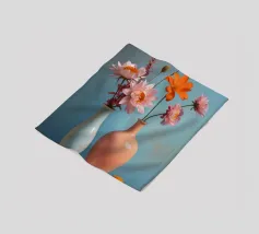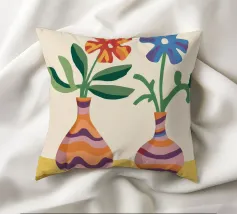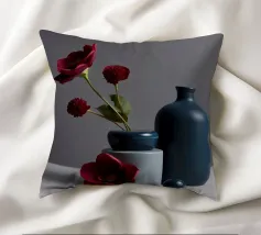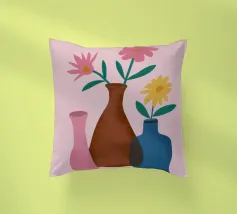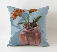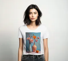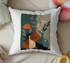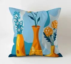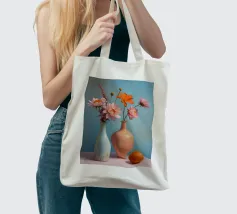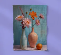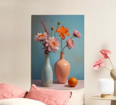 Elegante poster di natura morta con vasi in ceramica dai toni pastello riempiti di fiori sbocciati rosa e arancioni, su un morbido sfondo blu. Perfetto per aggiungere un tocco artistico e sereno agli interni moderni. Ideale per gli amanti dell'arte e dell'arredamento in cerca di ispirazione floreale.