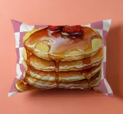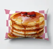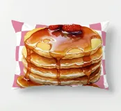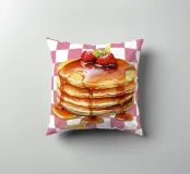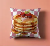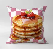 Una pila di pancake è sormontata da fragole e irrorata di sciroppo, su uno sfondo a scacchi bianchi e rosa. I colori vivaci e lo sciroppo lucido creano un aspetto invitante.