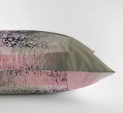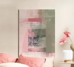 Pittura acrilica astratta con strati di pennellate e tinte laminate di rosa, verde salvia e oliva con accenti indaco testurizzati.