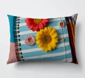Un taccuino a righe con fiori vivaci si trova su uno sfondo blu e rosa, accompagnato da matite colorate e da una matita arancione, per creare un'area di lavoro allegra.