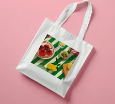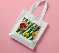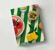 Vista dall'alto di un'insalata di pomodori freschi e di un bicchiere di vino su una tovaglia verde a righe all'aperto. La luce del sole e le ombre lunghe creano una scena vibrante, fresca e bella di una cena estiva.