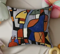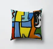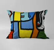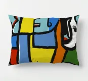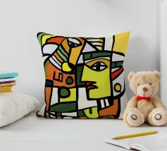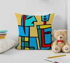 Due figure stilizzate dominano la composizione, caratterizzate da forme astratte e colori vivaci. Una figura appare di profilo mentre l'altra è rivolta in avanti, entrambe con tratti esagerati e una qualità stravagante.