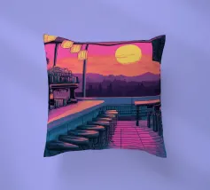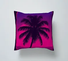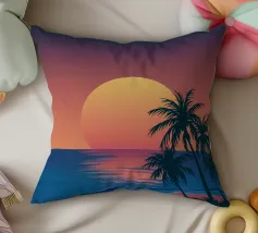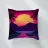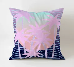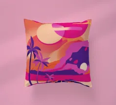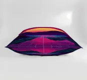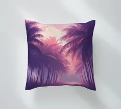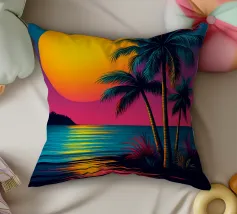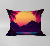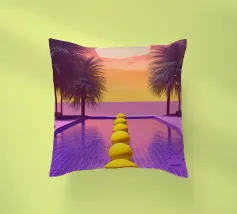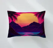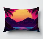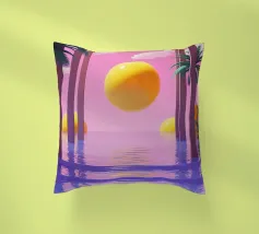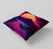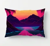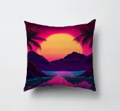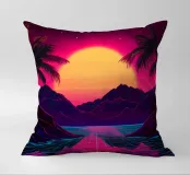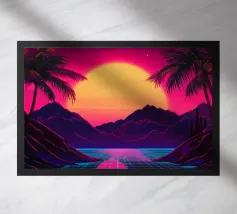 Questo motivo mostra una scena suggestiva in stile retrofuturistico: un enorme sole al tramonto colora il cielo di forti tonalità di giallo e magenta mentre sprofonda dietro una scura catena montuosa. In primo piano corre un pavimento luminoso a griglia che crea una prospettiva in profondità e termina in un corso d'acqua riflettente. Palme tropicali incorniciano l'immagine a sinistra e a destra. Lo stile visivo ricorda l'estetica synthwave e combina elementi naturali con immagini digitali.