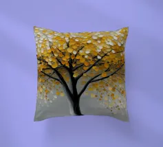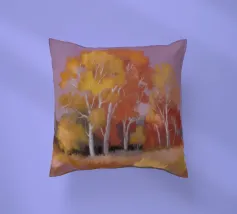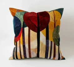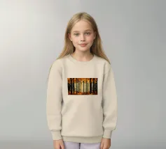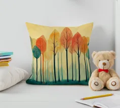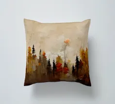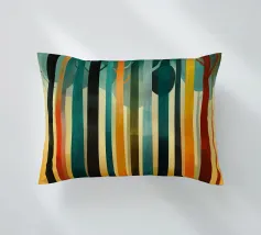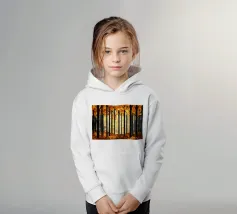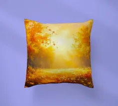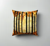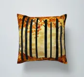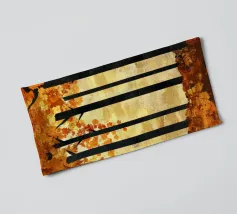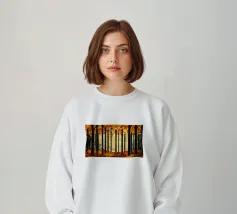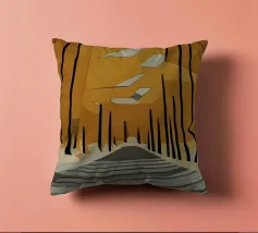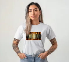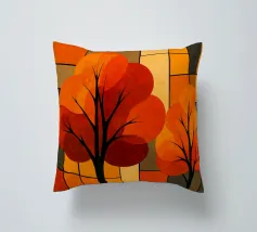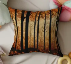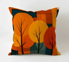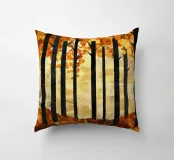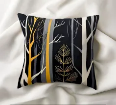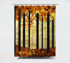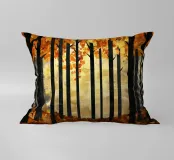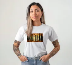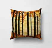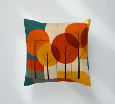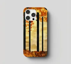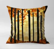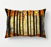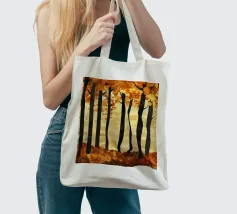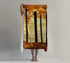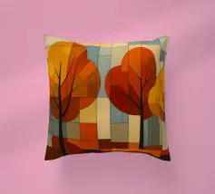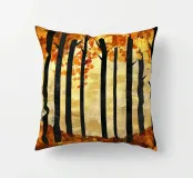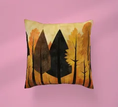 Una splendida rappresentazione astratta di una foresta autunnale con alti tronchi scuri e fogliame dorato. Lo sfondo caldo e luminoso esalta la composizione geometrica, creando un'atmosfera serena e moderna.