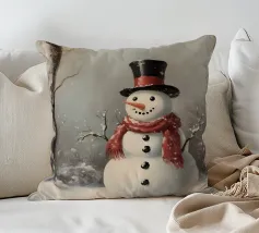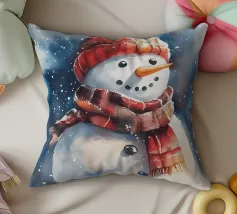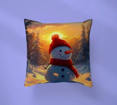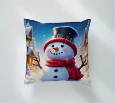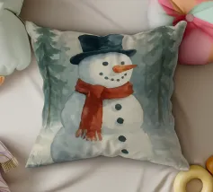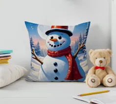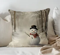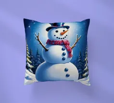 Un pupazzo di neve adornato con un cappello e una sciarpa si gode la serena bellezza di una foresta innevata al chiaro di luna, circondato da fiocchi di neve che cadono.