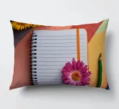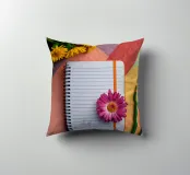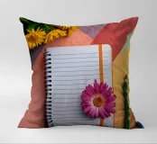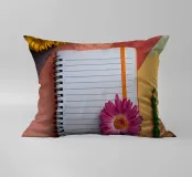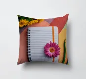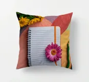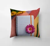 Un vivace spazio di lavoro mostra un quaderno a righe ornato da un fiore rosa, circondato da carte colorate e materiale artistico, che invita alla creatività e all'ispirazione.