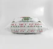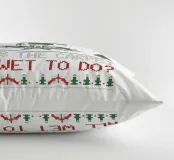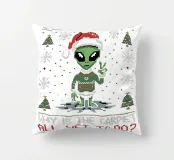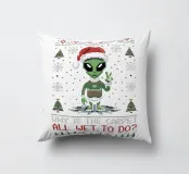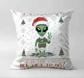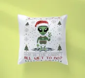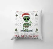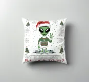 Un alieno con cappello da Babbo Natale e maglione natalizio è circondato da fiocchi di neve e alberi di Natale. Il disegno chiede ironicamente: "Perché il tappeto è tutto bagnato?" con colori festosi.