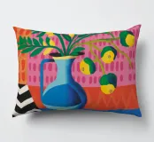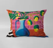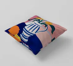 Un vivace bouquet di fiori e agrumi si trova in un vaso blu su un tavolo rosa. Lo sfondo è un mix dinamico di motivi a zig zag in bianco e nero e foglie verdi, che creano una natura morta moderna e giocosa.