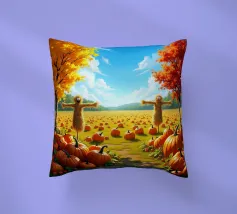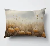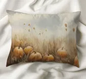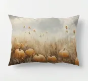 Zucche vivaci sparse in un campo erboso sotto un cielo nuvoloso, con alti fiori bianchi sullo sfondo. Cattura l'essenza dell'autunno.