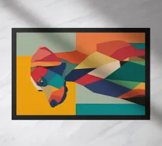 Una vivace illustrazione artistica di un cane seduto composta da forme geometriche sovrapposte in toni audaci e multicolori, con elementi astratti di foglie sullo sfondo, che creano un design moderno e accattivante.