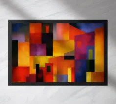 Una composizione astratta ricca e contemporanea, costruita con forme geometriche stratificate e colori profondi e suggestivi. Curve e blocchi si intersecano in una disposizione accuratamente bilanciata, creando un senso di ritmo architettonico e profondità visiva. La texture della superficie aggiunge un sottile calore pittorico, ammorbidendo la geometria e conferendo all'opera una presenza tattile e artigianale.