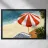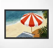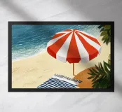 L'immagine mostra un'idilliaca scena da spiaggia: un ombrellone proietta la sua ombra su un materassino da spiaggia adagiato sulla sabbia calda. Sullo sfondo, il mare si estende con dolci onde, mentre l'immagine è incorniciata da piante verdi che creano un ambiente naturale. Lo stile è illustrativo e pittorico, con una superficie strutturata che ricorda una tela. I colori vivaci e i contrasti decisi creano un'atmosfera calda ed estiva che irradia calma e relax. Ha un'estetica affascinante, quasi nostalgica.