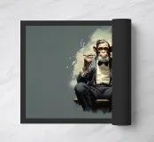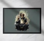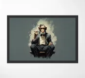 Una rappresentazione umoristica e artistica di uno scimpanzé vestito in smoking con bretelle, che fuma con sicurezza un sigaro, su uno sfondo neutro. L'immagine emana fascino ed eleganza con un tocco eccentrico.