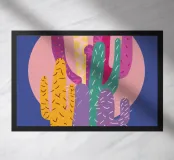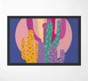 A mystical desert scene with various cacti silhouetted against a large pale sun and a purple twilight sky. The illustration has a magical, serene, and slightly surreal quality.