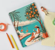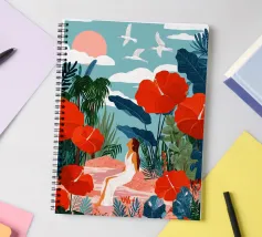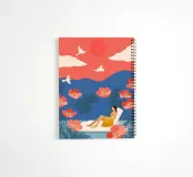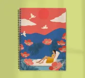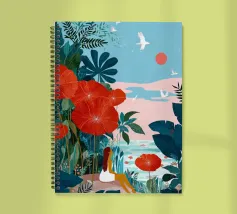 Tra imponenti papaveri corallini e palme piumate, una donna si sdraia pacificamente sotto un audace sole rosso, galleggiando su una pozza di quiete. Uccelli bianchi si librano in un cielo da sogno, facendo eco all'immobilità della sua posa. La scena, sullo sfondo di ricche montagne indaco e di un cielo color mandarino, cattura un'armonia surreale tra la natura e il sé, un momento sospeso in cui il tempo fiorisce e il pensiero si dissolve nel colore e nella calma.
