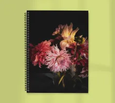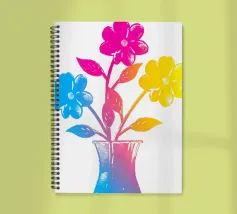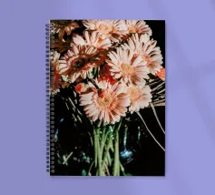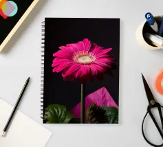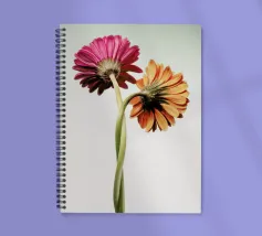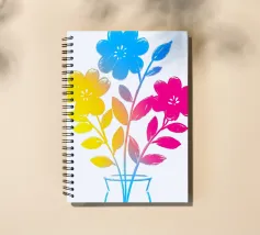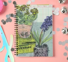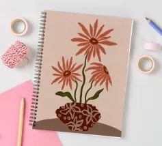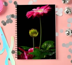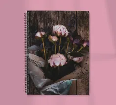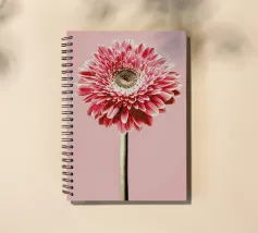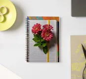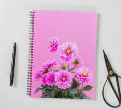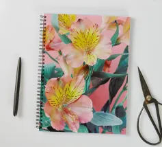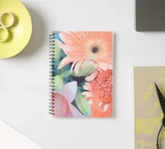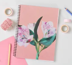 Un taccuino rilegato a spirale presenta tre fiori rosa e foglie verdi, disposti su una superficie di legno colorato, che invitano alla creatività e all'ispirazione.