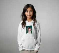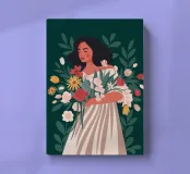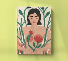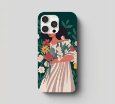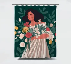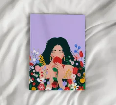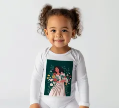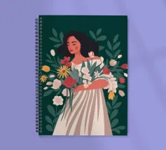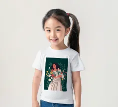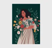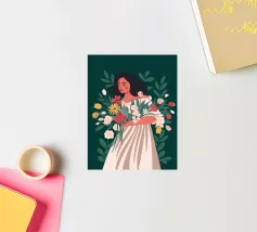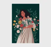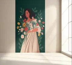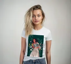 Una persona con un bouquet di fiori in mano si trova in mezzo a un giardino lussureggiante, vestita di bianco. L'ambientazione riflette l'armonia con la natura.