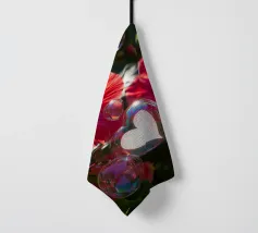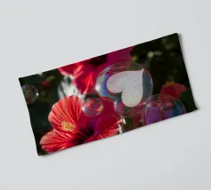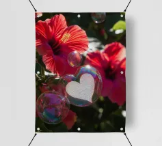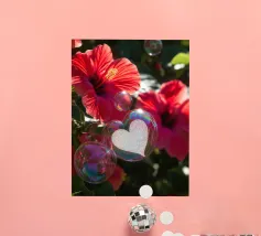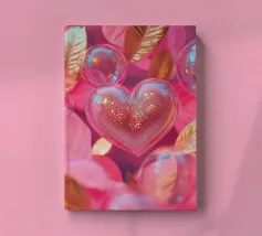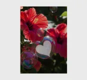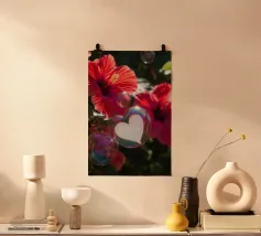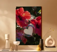 Cuore romantico con fiori di ibisco rossi - Questa vibrante opera d'arte presenta un cuore scintillante in una bolla trasparente, che fluttua tra fiori di ibisco rosso brillante in piena fioritura. Le foglie verdi e i petali rosso intenso creano un contrasto sorprendente, mentre la luce del sole si riflette magnificamente sulla bolla, aggiungendo un'atmosfera sognante e stravagante. Questo quadro è ideale per aggiungere un tocco di romanticismo e di eleganza ispirata alla natura a qualsiasi ambiente.