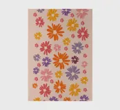 Un motivo floreale giocoso che sembra una passeggiata visiva in un festival di giardini retrò: I fiori stilizzati, nei colori arancione, rosa, viola, rosso e giallo, danzano liberamente. Ogni fiore ha una forma semplice, simile a una margherita, con lunghi petali a raggiera che emergono da un punto centrale. La disposizione è volutamente irregolare, come un disegno sparso di gioia, estate e nostalgia.