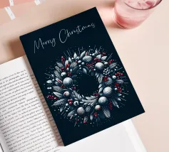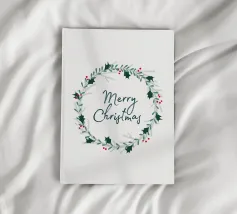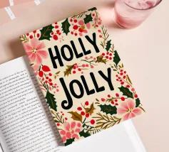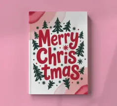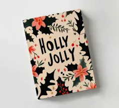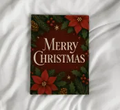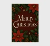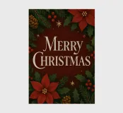 Una calda ed elegante illustrazione natalizia con vibranti stelle di Natale, rami di pino, bacche e stelle dorate che circondano un messaggio senza tempo di "Buon Natale". I ricchi rossi e i verdi intensi creano un'atmosfera classica e festosa, perfetta per interni accoglienti, angoli regalo e decorazioni stagionali.