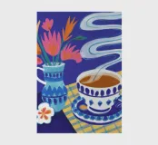 Illustrazione stravagante di una tazza di caffè fumante in una tazza a scacchi blu e bianchi, con fiori stilizzati che fluttuano sopra di essa, su uno sfondo blu scuro e ondulato.