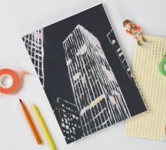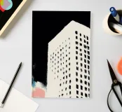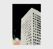 Einfache Risograph-Illustration eines weißen Gebäudes auf schwarzem Hintergrund. Minimalistische Linien und Formen, kombiniert mit Farbakzenten in Hellrosa und Dunkelbeige. Mischung aus Aquarell-Optik, kräftigen Blockdrucken und strukturierten Palette-Knife-Effekten.