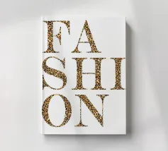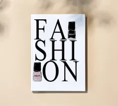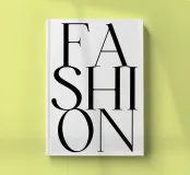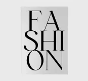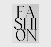 La parola "FASHION" è scritta in grassetto con lettere nere disposte verticalmente. Il carattere elegante e raffinato sottolinea l'eleganza e il design moderno.