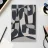 L'immagine è caratterizzata da audaci forme sovrapposte in bianco e nero, che creano un dinamico motivo astratto. I forti contrasti tra luce e buio ne esaltano l'impatto visivo.
