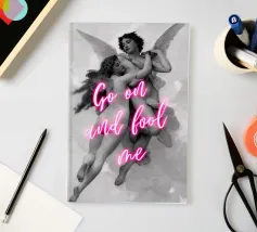Abbracciate un fascino malizioso con "Go On and Fool Me", un'accattivante stampa pop art che fonde abilmente la ritrattistica classica con una sfida giocosa e contemporanea. Questa intrigante opera d'arte presenta un bellissimo personaggio storico, ornato da delicati fiori e da una sottile bolla di sapone. L'audace testo rosa caldo "GO ON AND FOOL ME" sovrasta l'immagine, aggiungendo una dichiarazione spiritosa e un po' provocatoria. È una fusione perfetta di eleganza senza tempo e umorismo moderno, ideale per aggiungere personalità e un tocco di spensieratezza a qualsiasi interno moderno. Realizzato ad un'eccezionale risoluzione di 7000x5000 pixel
