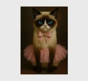 Portate a casa un pezzo di Assurdismo elegante con questo sorprendente ritratto di un gatto siamese molto poco impressionato, vestito con un delicato tutù rosa e un fiocco abbinato. I suoi penetranti occhi blu e la sua espressione scontrosa contrastano magnificamente con il giocoso abito da ballo, creando un'opera d'arte umoristica ma raffinata. Perfetto per gli amanti dei gatti, per i fan del balletto o per tutti coloro che amano un tocco di ironia nel loro arredamento. Questa stampa è un regalo unico e un pezzo forte, che unisce lo stile classico del ritratto a un umorismo assurdo.