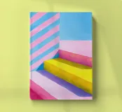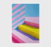 Illustrazione a guazzo di gradini gialli davanti a pareti a strisce rosa-blu-gialle. Sfondo minimalista, linee decise, forme geometriche e composizione chiara. Blocchi di colore vivaci in tonalità pastello di rosa, blu, giallo e bianco creano un'illustrazione astratta, vivace ed estetica.
