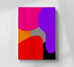 Vibranti forme geometriche in viola, rosso, giallo e blu si sovrappongono su un audace sfondo giallo e scuro, mostrando un'arte astratta dal tocco moderno.