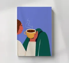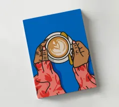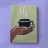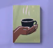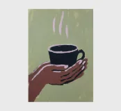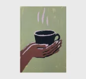 Illustrazione astratta di una mano scura che tiene una tazza di caffè nero. Un delicato vapore sale in leggere linee color lavanda. Lo sfondo è verde chiaro con pennellate sottili. Composizione minimalista con attenzione alla forma, al colore e all'equilibrio.