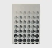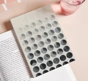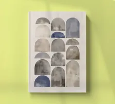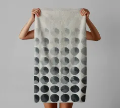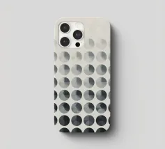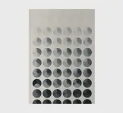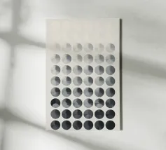 Un'opera d'arte astratta concettuale e minimalista composta da una griglia precisa di forme circolari, che passa gradualmente da valori tonali chiari a valori scuri. Ogni cerchio è sottilmente segmentato in campi geometrici, creando un tranquillo ritmo matematico e un senso di progressione sistematica.