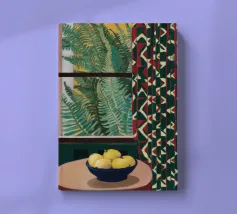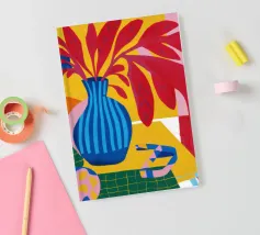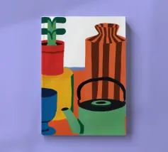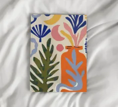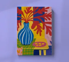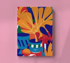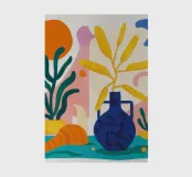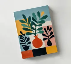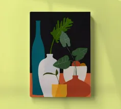 Una moderna natura morta astratta con una pianta stilizzata in un vaso blu, un croissant e forme organiche sotto un sole giallo, il tutto in una composizione equilibrata e calda.