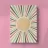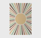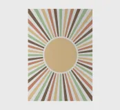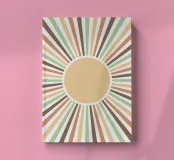 Linee radianti in tonalità terrose come il verde, il marrone e l'arancione si estendono da un cerchio centrale, creando un effetto a raggiera. Il design è caratterizzato da un'estetica retrò con motivi simmetrici e una tavolozza di colori rilassanti.