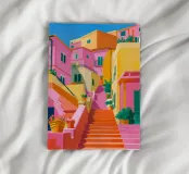 Una vivace scena di strada con edifici colorati e una scalinata rosa acceso che sale verso l'alto, evocando una vivace città costiera mediterranea o italiana.