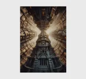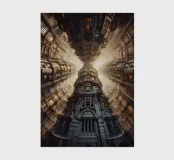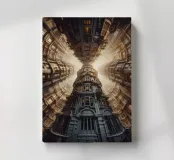 Una rappresentazione surreale di strutture architettoniche simmetriche e torreggianti che convergono verso una luce centrale incandescente. I disegni intricati, l'illuminazione calda e la prospettiva drammatica creano un'immagine impressionante e ultraterrena.