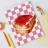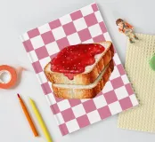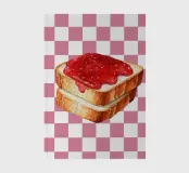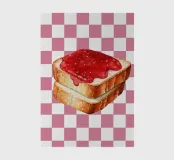 Una pila di tre fette di pane tostato con sopra un generoso strato di marmellata rossa brillante si trova su uno sfondo a scacchi bianchi e rosa. La rappresentazione realistica del pane contrasta con lo sfondo geometrico e giocoso.