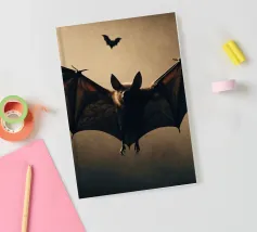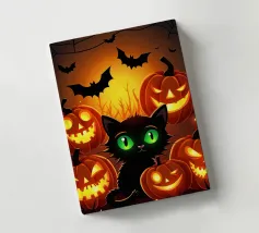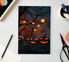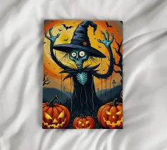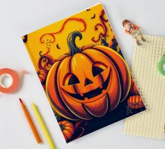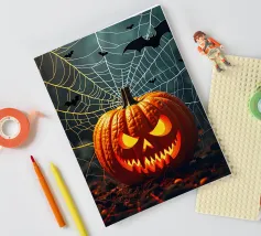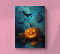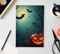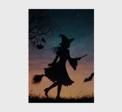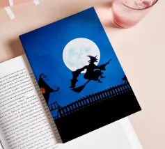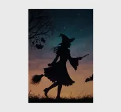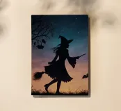 Al calare del crepuscolo, una strega in silhouette vola a cavallo della sua scopa tra i pipistrelli, con una zucca incandescente in primo piano, creando un'atmosfera incantevole.