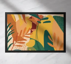 Una moderna composizione astratta di varie forme botaniche stilizzate e foglie in una tavolozza di terracotta, beige e blu scuro su uno sfondo chiaro.