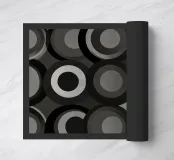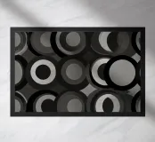 Una vivace serie di cerchi sovrapposti in diverse tonalità di grigio, nero e bianco crea un motivo visivo accattivante. Il disegno presenta toni contrastanti che aggiungono profondità.